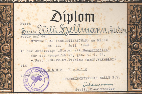 Unsere Stute Jucking ist 1941 geboren und erhielt den Titel Staatsprämienstute. Willi Hellmann gewann mit ihr im Jahr 1949 auf der Kreistierschau in Melle: Zwei erste und zwei zweite Preise.