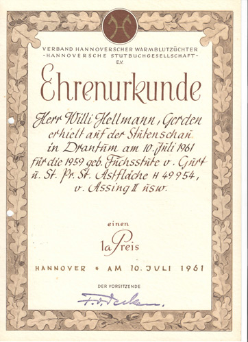 Herr Willi Hellmann, Gerden erhielt auf der Stutenschau in Drantum am 10. Juli 1961 für die 1959 geb. Fuchsstute v. Gurt u. St. Pr. St. Astflache H 49954, v. Assing II usw. einen 1a Preis