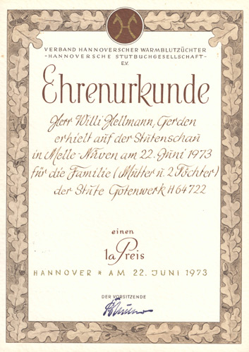 Herr Willi Hellmann, Gerden erhielt auf der Stutenschau in Melle-Nüven am 22. juni 1973 für die Familie (Mutter u. 2 Töchter) der Stute Gotenwerk H 64722 einen 1a Preis