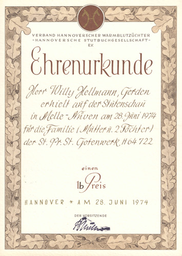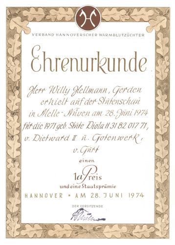 Herr Willi Hellmann, Gerden erhielt auf der Stutenschau in Melle-Nüven am 28. Juni 1974 für die 1971 geb. Stute Diola H 318201771, v. Dietward II u. Gotenwerk, v. Gurt einen 1a Preis und eine Staatsprämie