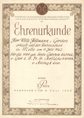 Herr Bauer Willi Hellmann, Gerden, erhielt in der Abt. : "Dreijährige Stuten" auf der Stutenschau (Kreistierschau) zu Melle am 13.07.1949 für die von ihm vorgeführte hannoversche Warmblutstute (H.-Stute) - Fuchs - : v. Assing II u. Jucking St. Pr. Stute H 37 224 usw. einen Ersten Preis.