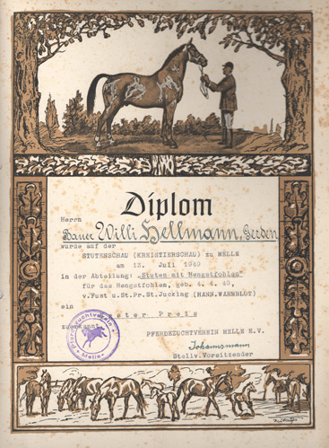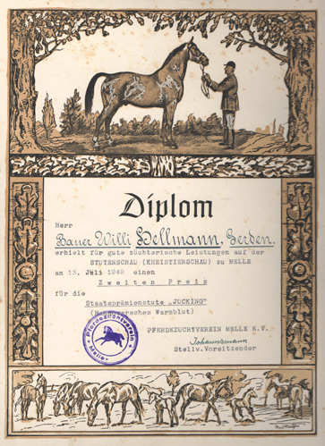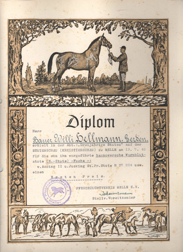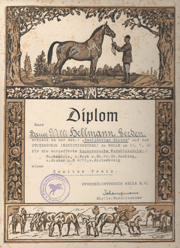 Herrn Bauer Willi Hellmann, Gerden, wurde auf der Stutenschau (Kreistierschau) zu Melle am 13. Juli 1949 in der Abteilung: "Stuten mit Hengstfohlen" für das Hengstfohlen, geb. 04.04.1949, v. Fust u. St. Pr. St. Jucking (Hann. Warmblut) ein Erster Preis zuerkannt.