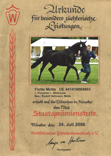 Flotte Motte erhielt 2006 auf der Eliteschau in Münster den Titel: Staatsprämienstute.