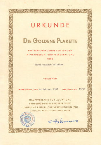 Die Goldene Plakette für hervorragende Leistungen in Pferdezucht und Pferdehaltung wird Herrn Wilhelm Hellmann verliehen.