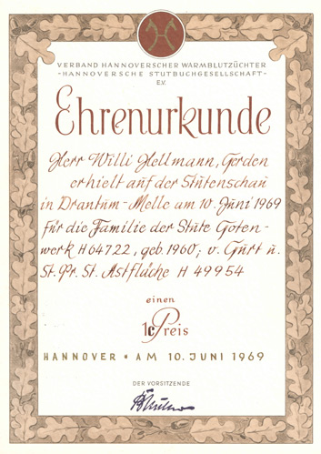 Herr Willi Hellmann, Gerden erhielt auf der Stutenschau in Drantum-Melle am 10. Juni 1969 für die Familie der Stute Gotenwerk H 64722, geb. 1960, v. Gurt u. St. Pr. St. Astfläche H49954 einen 1c Preis
